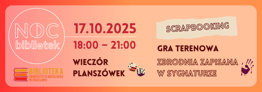Biblioteka Uniwersytetu Medycznego we Wrocławiu serdecznie zaprasza studentów, doktorantów oraz pracowników UMW do udziału w wydarzeniu organizowanym w ramach ogólnopolskiej akcji Noc Bibliotek.